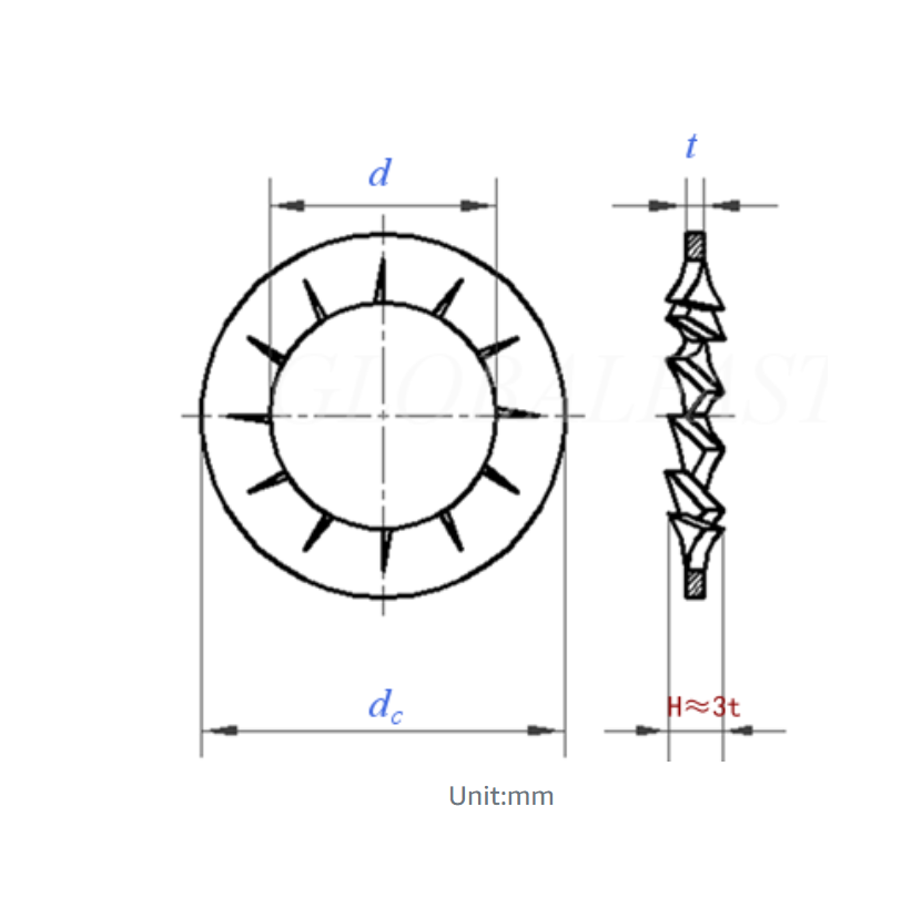 J, with internal and external teeth) arelocking washers with serrations on both the inner and outer edges. This dual-toothdesign allows the washer to bite into both the fastener and the bearing surface,providing enhanced resistance to loosening and improving electrical conductivityIt is suitable for applications requiring a higher level of locking security.
